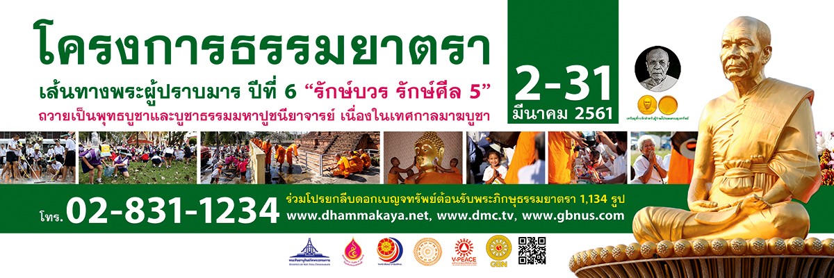 ขอเชิญผู้มีบุญร่วมโปรยดอกเบญจทรัพย์ ถวายการต้อนรับพระธรรมยาตรา 1,134 รูป ที่อนุสรณ์สถาน พระมงคลเทพมุนี ปีที่ 6 เริ่มวันที่ 2 ถึง 31 มีนาคม พ.ศ. 2561 ดูรายละเอียดได้ที่ www.dhammakaya.net www.dmc.tv และชมการถ่ายทอดสดกิจกรรมธรรมยาตราได้ทาง www.gbnus.com สอบถามรายละเอียด 02-831-1234
