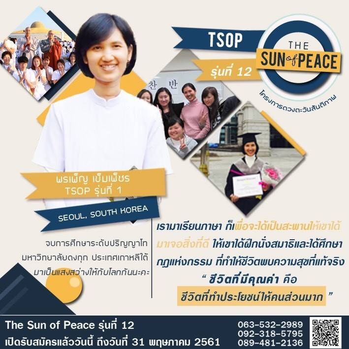 โครงการ The Sun of Peace ได้เรียนภาษา เพื่อเป็นสะพานให้ทุกคนพบเจอสิ่งที่ดี เพราะ “ชีวิตที่มีคุณค่า คือชีวิตที่ทำประโยชน์ให้คนส่วนมาก” สนใจศึกษาต่อ และปฏิบัติหน้าที่ ณ ศูนย์สาขาต่างประเทศ สอบถามเพิ่มเติม 063-532-2989