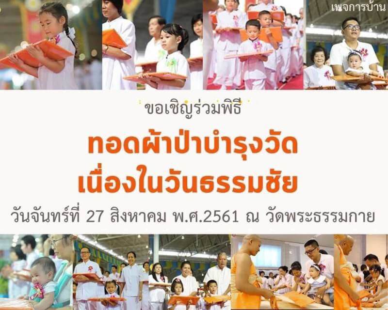 กำหนดการวันธรรมชัย พิธีทอดผ้าป่าบำรุงวัด ครั้งที่ 2/2561 7.00 ตักบาตร ณ บ้านแก้วเรือนทองคุณยายฯ 9.30 ปฏิบัติธรรม/ถวายภัตตาหารเป็นสังฆทาน 13.30 พิธีทอดผ้าป่าบำรุงวัด/ถวายไทยธรรม/ถวายปัจจัย 17.30 พิธีบูชาพระมหาธรรมกายเจดีย์และมหาปูชนียาจารย์ 18.00 พิธีสวดธัมมจักกัปปวัตตนสูตร ครบ 662,000,000 จบ