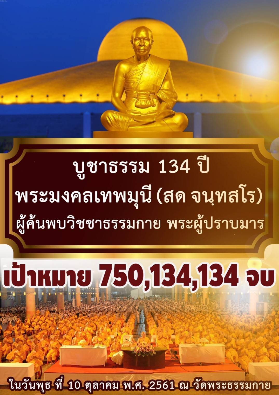 บูชาธรรม 134 ปี พระมงคลเทพมุนี (สด จันทสโร) ผู้ค้นพบวิชชาธรรมกาย พระผู้ปราบมาร สวดธรรมจักร 750,134,134 จบ ในวันพุธที่ 10 ตุลาคม พ.ศ. 2561